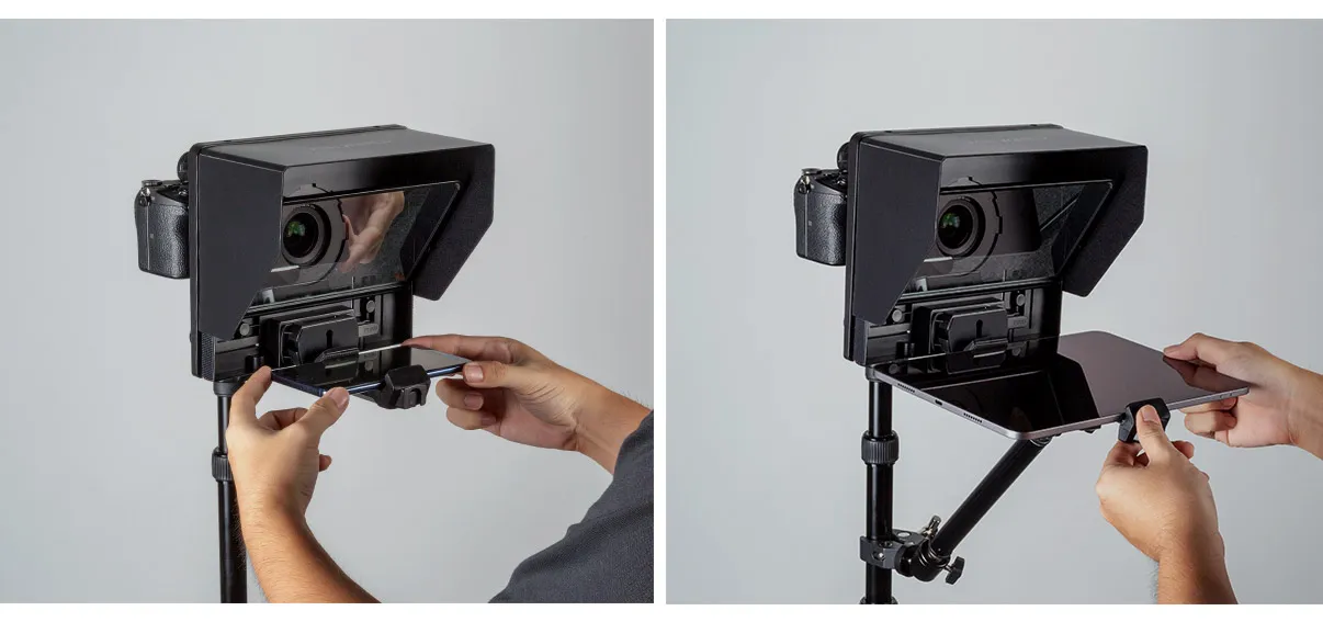 There are two 1/4″ standard size mounting threads on the top of the teleprompter and three 1/4″ standard size mounting threads on the bottom. The bottom ones can be connected to a tripod, light stand, etc., and the top one can be installed with a microphone, fill light, etc., to enrich your .